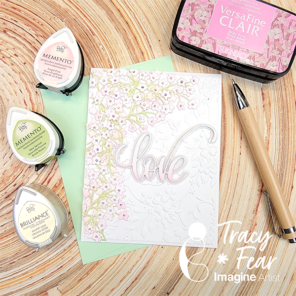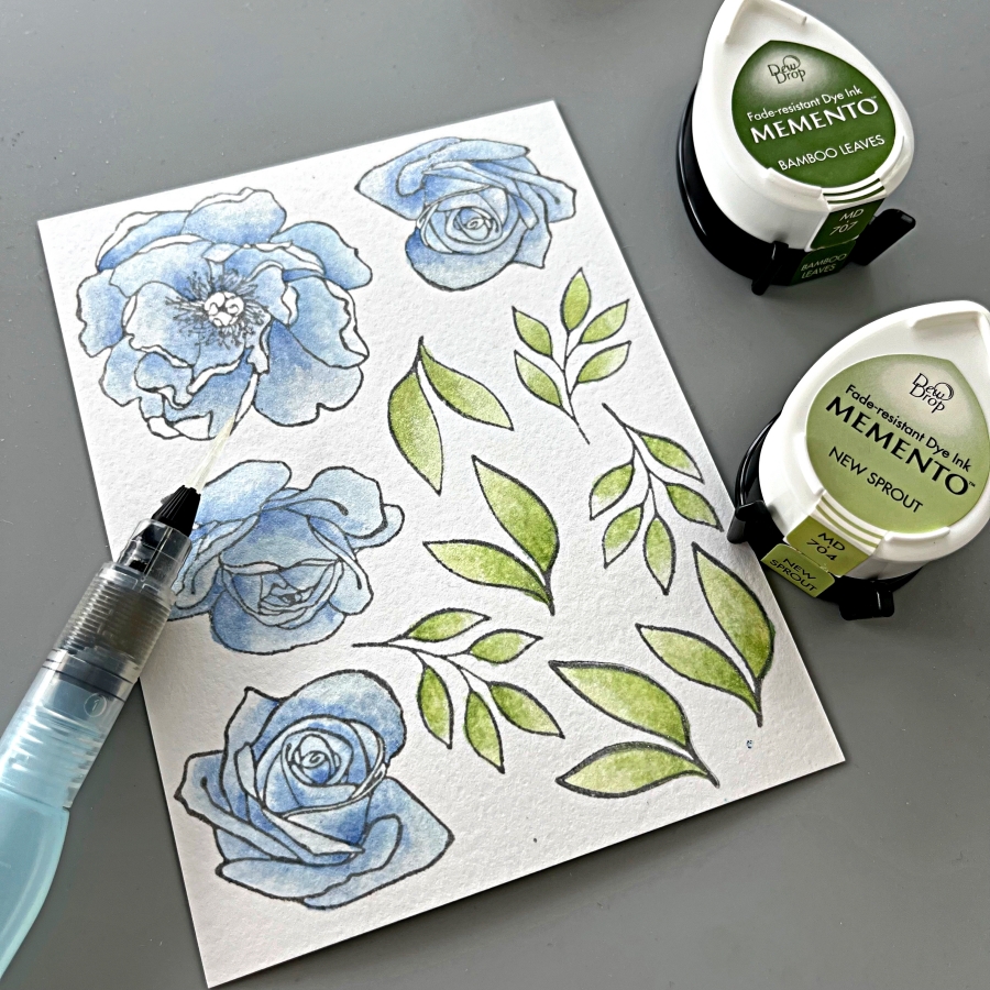 The leaves were colored with Memento New Sprout and Bamboo Leaves ink. I hope you can see the shimmer from the spray a little better in this picture. It is hard to capture the fine sparkle on camera, but the shimmering effect is truly mesmerizing in person.