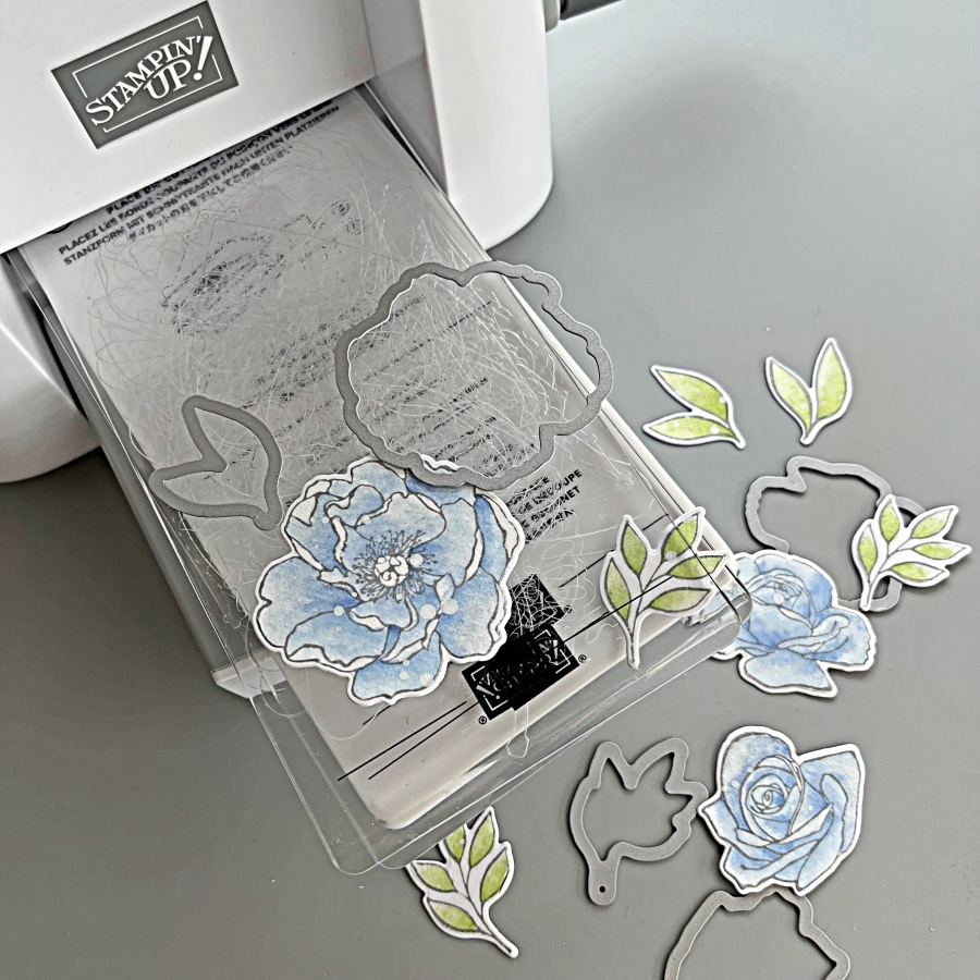 Now we are ready to die cut the images. The coordinating Blossoming Happiness dies are compatible with the Mini Stampin’ Cut and Emboss Machine.