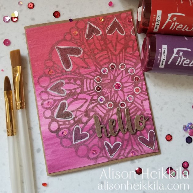 “I wanted to create a background with vibrant, blended color that was also super shimmery. Fireworks! Spray was the perfect product. The colors are so bold, and the shimmer is beautiful. Using a stencil and a few other simple products made this card come together very quickly.”