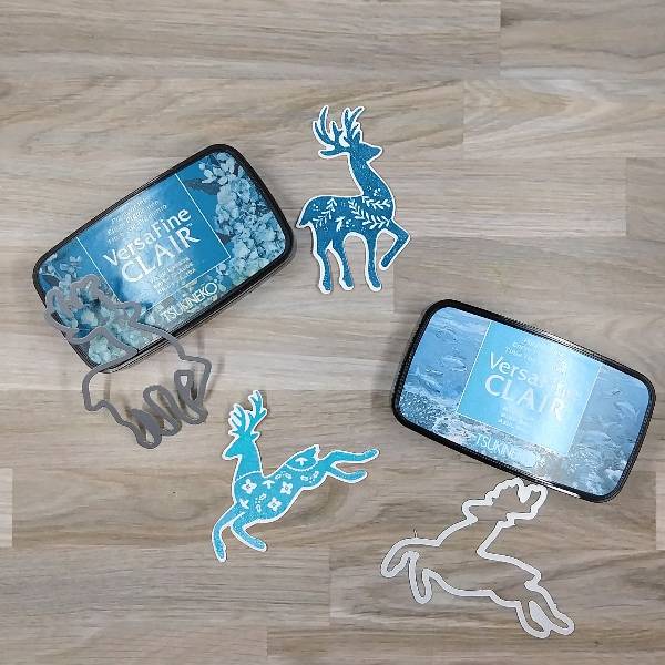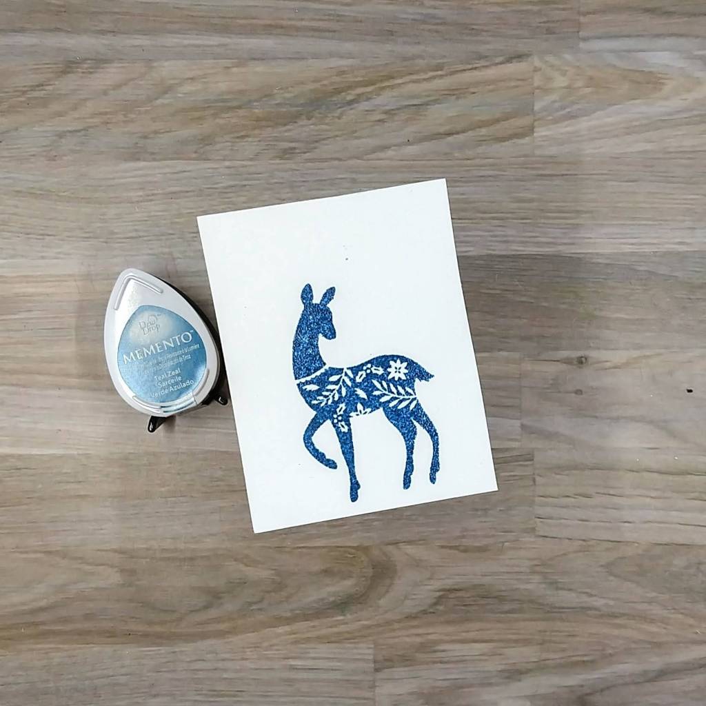 Stamp the holly leaves and berries using StazOn Opaque – Cotton White on the ornament around the sentiment using the stamping tool or small stamping blocks.