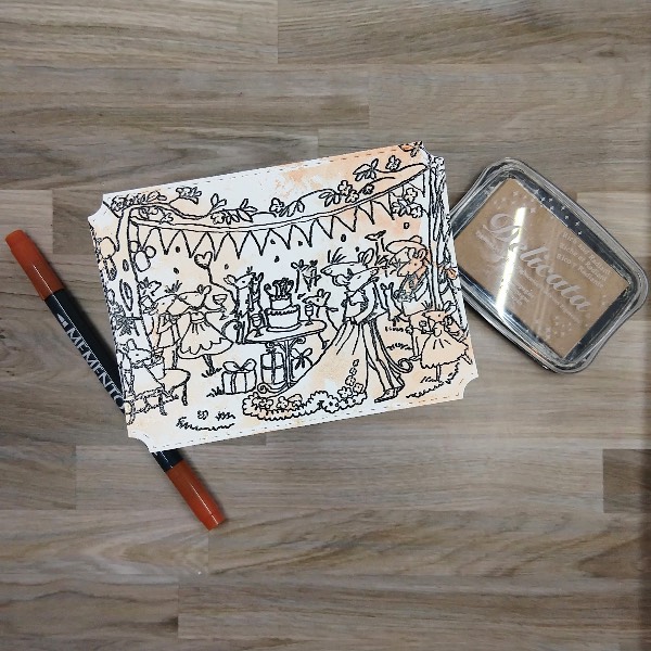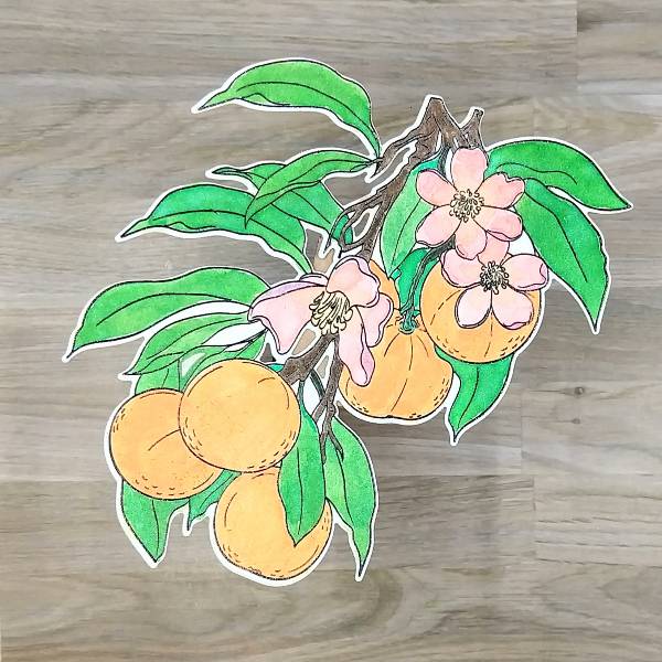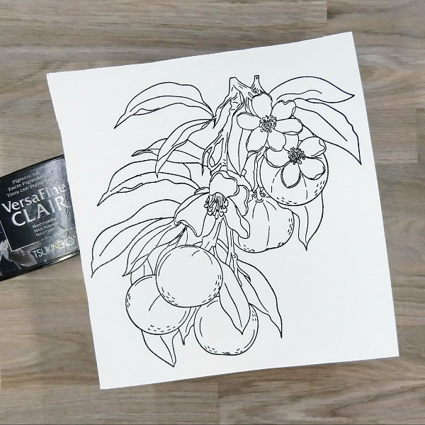 Draw a circle and branches with the Rich Cocoa Memento Marker brush tip. You also can use a circle template to draw the circle.