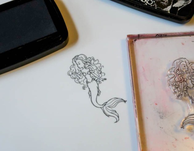 Place a piece of white cardstock in a stamping aid and place the stamp over the cardstock in the desired position. Close the lid of the stamping aid to affix the stamp to the lid. Pounce VersaFine Nocturne ink over the stamp; close the lid to stamp the image onto the cardstock. Repeat this step if necessary to get a good impression. Leave the stamp affixed to the stamping aid.