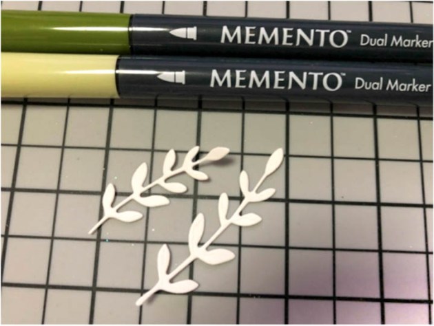 Die cut the Calla Lily and leaves. Prep space to create flowers. Heat glue, glue gun, die cuts and Heartfelt Creations Pastel Pollen Stamens. (Note I colored the back of the die cuts as well, but turns out it is not necessary because the back of the images do not show on the finished card.)