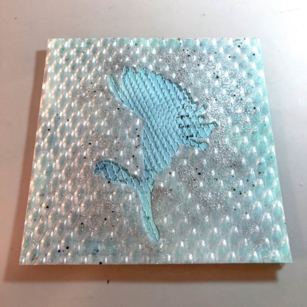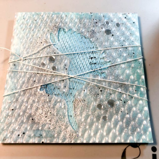Use Versa Magic Aqua Splash Dew Drop to ink all outside edges of the tri-fold card. Front is shown.