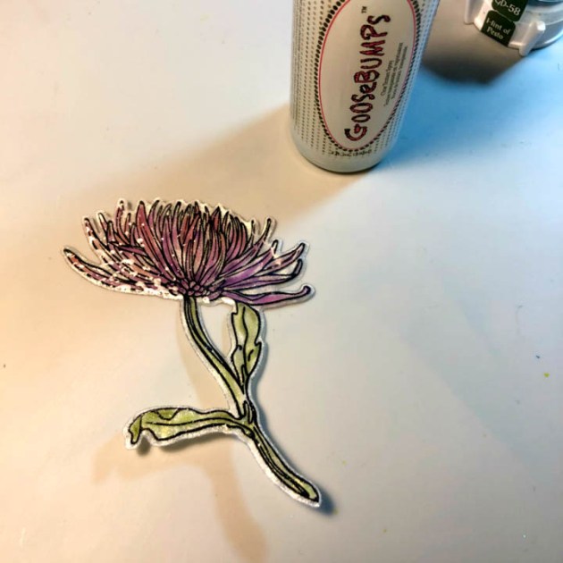 Holding the Cally Lily die cut with a pair of tweezers and heat the back of foam paper until it just begins to curl. The foam paper will curve towards the heat. While the foam paper is still warm gently add a small dab of hot glue at the very base of the Cally Lily. Place stamen and pinch closed, hold for a moment until hot glue cools and flower will hold it’s shape. Repeat with remaining five flowers.