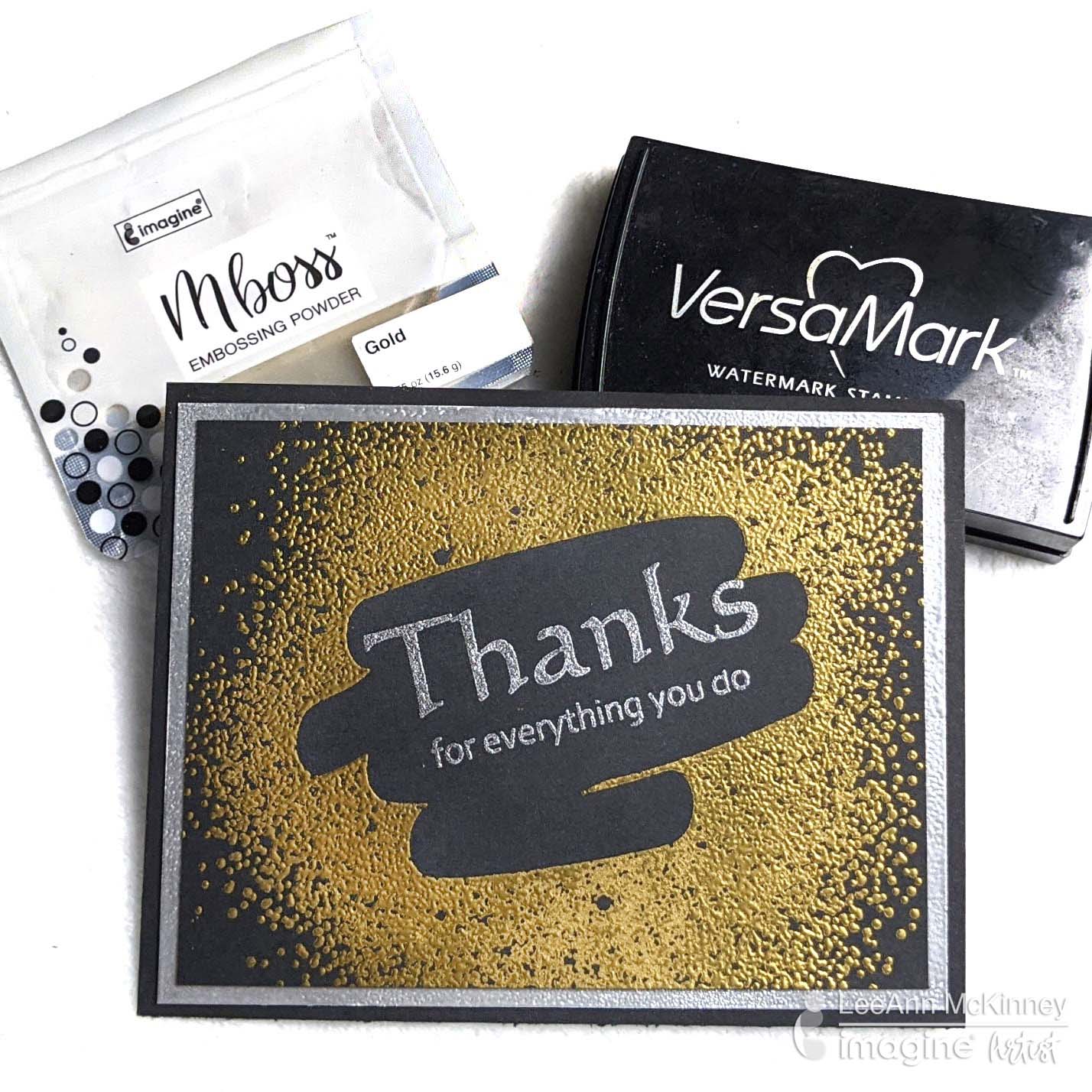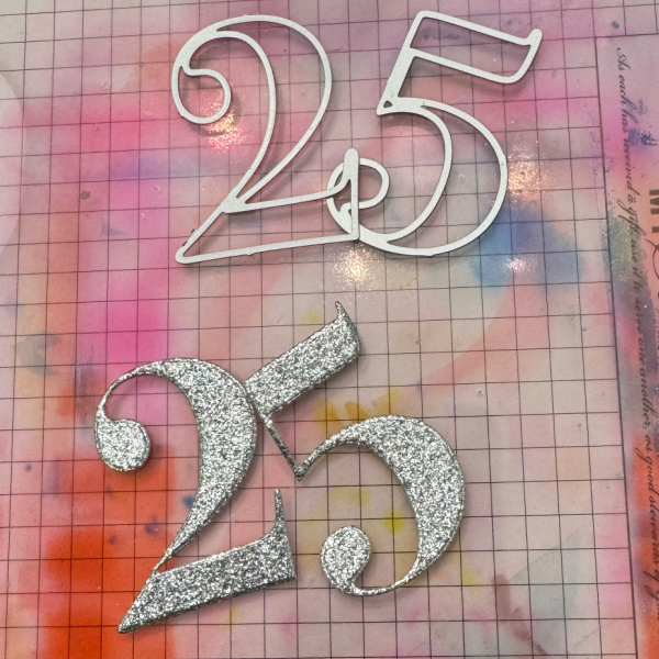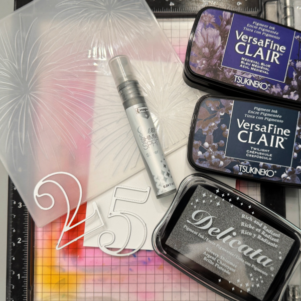 Directions: Gather your supplies. You will need an embossing folder, two different colors of dark ink, metallic ink, shimmer spray, number dies, and glitter paper.