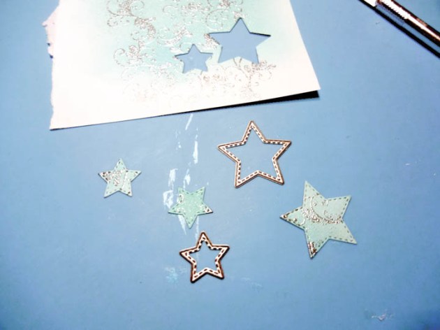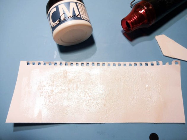 Leave the stencil in place for this step. Use an ink blusher and a small amount of gloss texture paste and swipe it over the stencil. Using a small amount at a time will prevent the paste from seeping underneath the stencil. Carefully remove the stencil and leave to dry. Wash your stencil immediately.