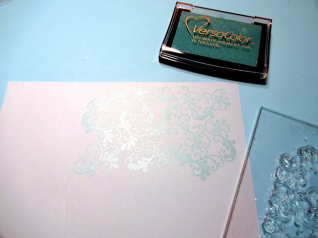 Use VersaFine Clair Glamorous and stamp onto white cardstock using a background design. Die-cut small and large hearts out of the stamped piece.