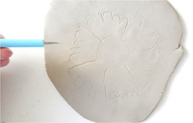 Using a stylus, draw out the desired shape. Use can also a template or other items you can place over the clay and trace. If you change your mind, remove the line by smoothing out the clay.
