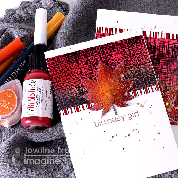 On the right page the stamped elements are determined, then half are removed before stamping to allow for clean stamping of correct colors. The remaining elements are added and stamped. It was easier to stamp all the images Memento Lady Bug at one time, then follow with images in Memento Danube Blue.