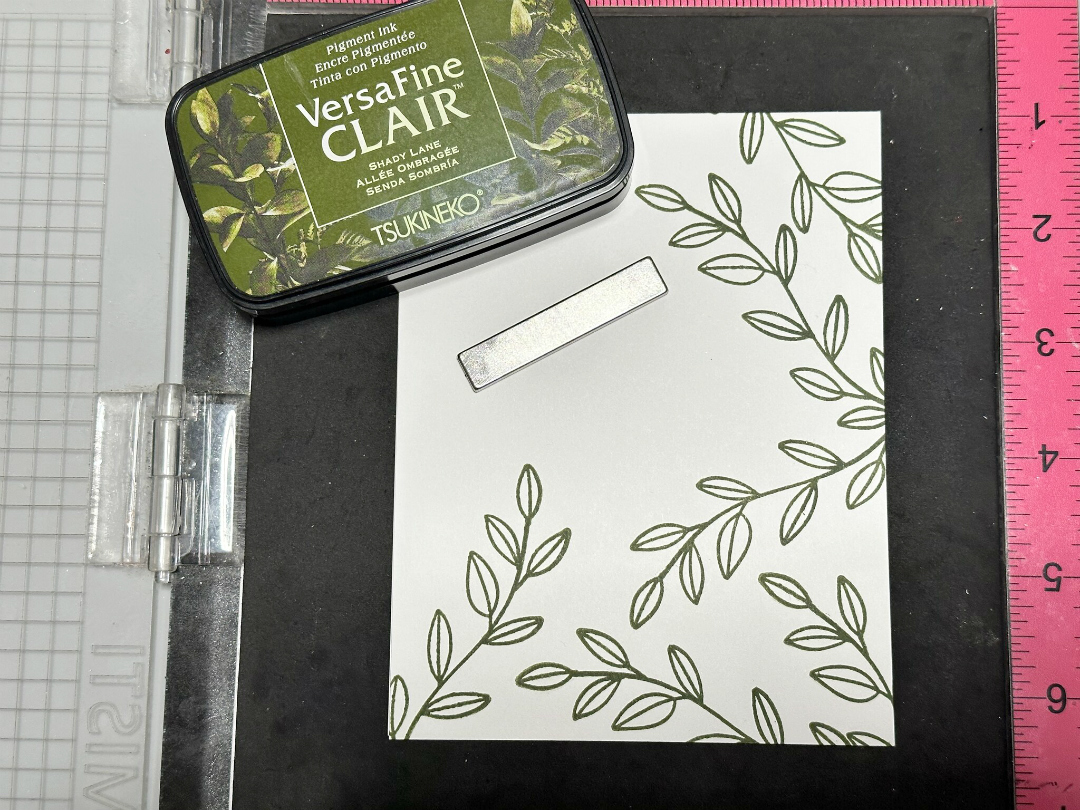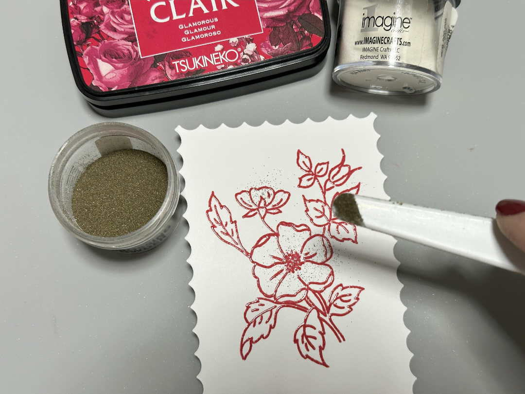 Remove the impute panel from the platform and place onto paper. Sprinkle Clear MBoss powder onto the stamped sentiment. Dump the excess back into the container. Heat set the sentiment.