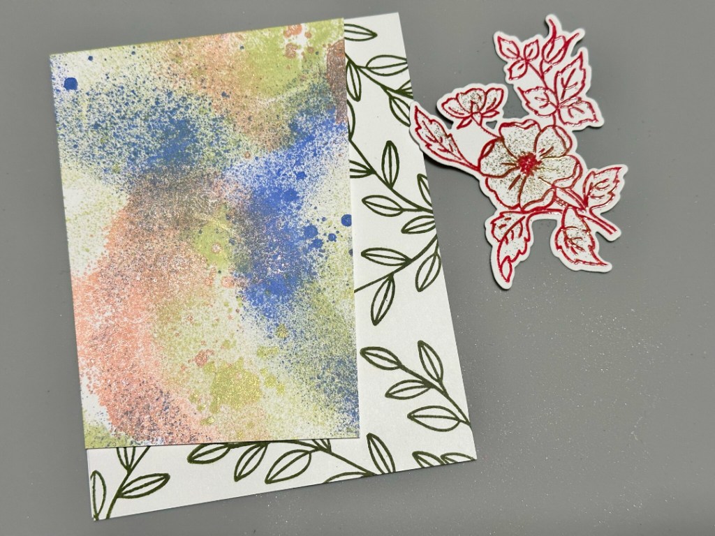 Repeat Steps 4A and 4B to add more shimmery walnut ink to the containers (6A). Load a paint brush with the ink then tap the paint brush to splatter the image panel (6B). Repeat with the second color. I wanted more splatter, so I loaded a clean toothbrush with ink and splattered the panel even more. (No photo). Remove the masks and heat set the panel.