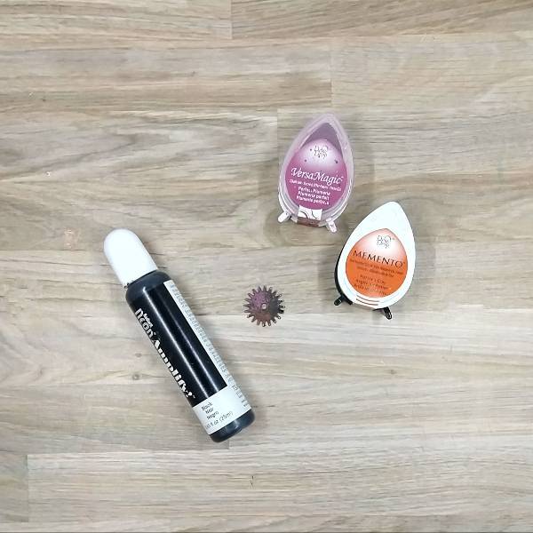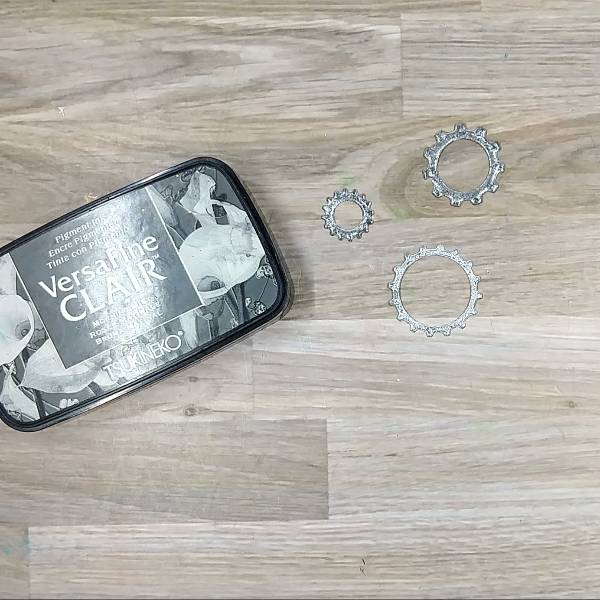 Repeat step one with a second gear. Then press another gear into both a Potter’s Clay Memento ink pad as well as Perfect Plumeria VersaMagic ink pad to make the gear look like it had rusted over.