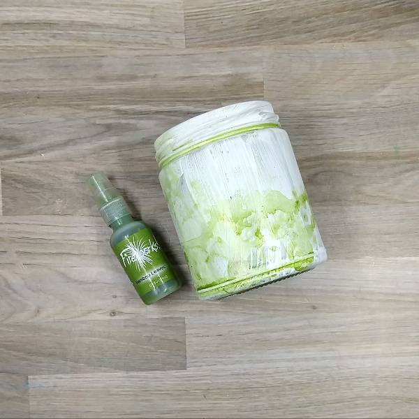 Paint a cleaned jar with gesso. Let it dry overnight. Then spray the jar with Bamboo Leaves Fireworks! Craft Spray and spin the jar to help move the spray around the jar. Repeat to color the whole bottom part of the jar and allow to dry.