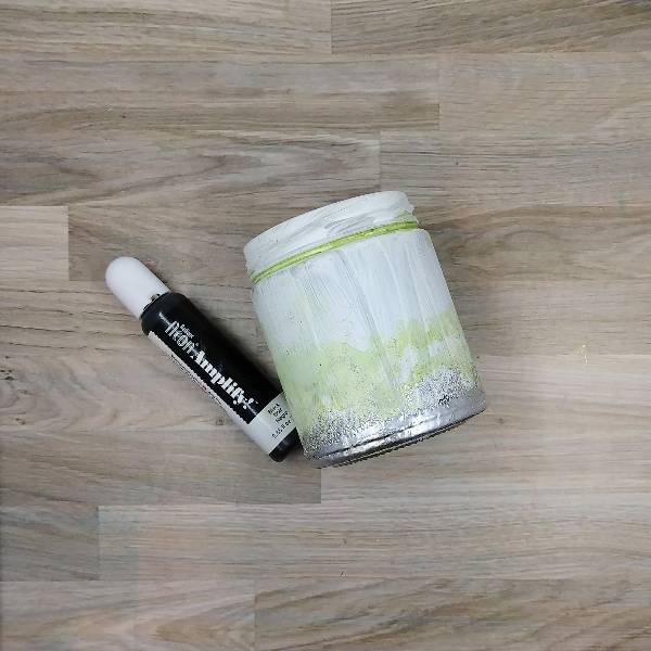 Using a sponge dauber, add a thin layer of black Amplify! To the bottom part of the jar and then used the wet Amplify! to adhere silver embossing powder and then heated the powder to create a silver bottom to the jar.
