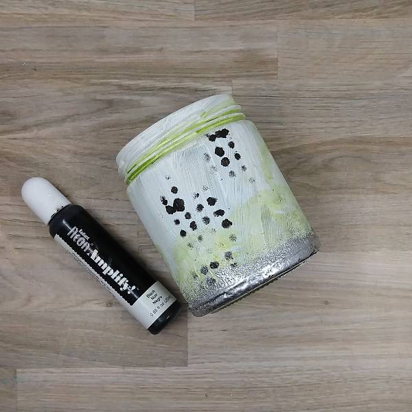 Use a circular stencil and the same sponge dauber to add more black Amplify! to the center of the jar (on one side) and use a heat tool to dry.