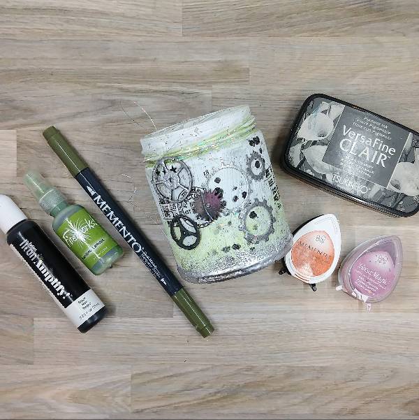 Add rub on stickers next to the black circles. Glue the watercolor die cut gears over the stenciled black circles and then glue the two smaller metal gears over the top of them. Attach the largest gear by tying it onto the neck of the jar with silver thread. Splatter the jar with Northern Pine Memento Dual Tip Marker to finish the project.