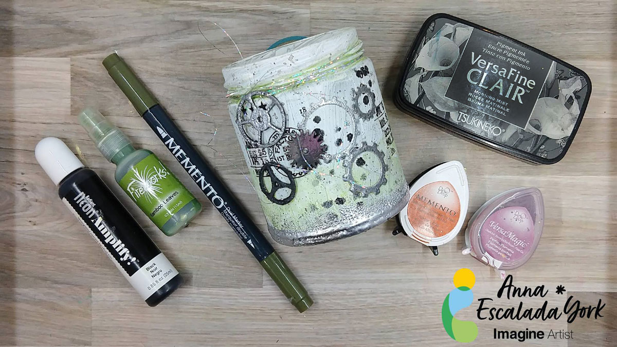 Add rub on stickers next to the black circles. Glue the watercolor die cut gears over the stenciled black circles and then glue the two smaller metal gears over the top of them. Attach the largest gear by tying it onto the neck of the jar with silver thread. Splatter the jar with Northern Pine Memento Dual Tip Marker to finish the project.