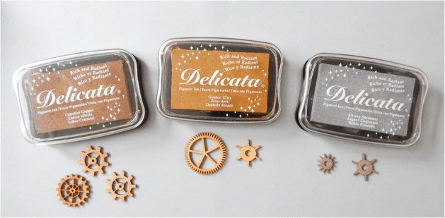 Use a Sponge Dauber to apply Starlite Silver Brilliance Ink to a strip black mixed media paper. Sorry that there’s no photo. Use cog dies to cut the silver-inked black paper.