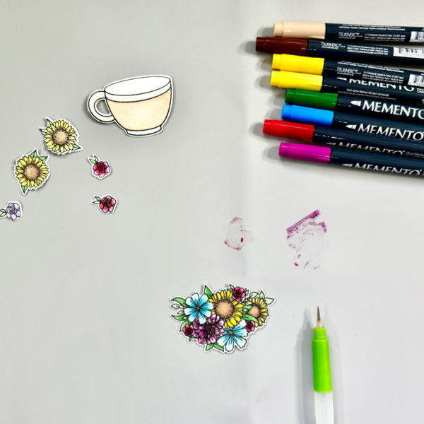 On a piece of watercolor cardstock, stamp all the floral and cup images with the VersaFine Onyx Black ink.