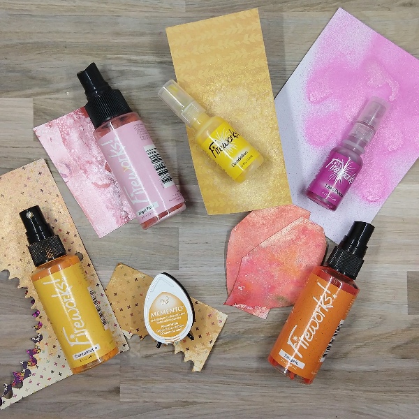 Step 1: Pull out some scraps of paper from your stash and a variety of sprays and ink. Spray the scraps with the sprays. My scraps were colored with Cantaloupe, Angel Pink, Dandelion, Lilac Posies, and Tangelo Fireworks! Craft Sprays as well as Peanut Brittle Memento Ink. After the spray dried, die cut the scraps of paper with leaf dies. Reserve some of the sprayed paper for later.