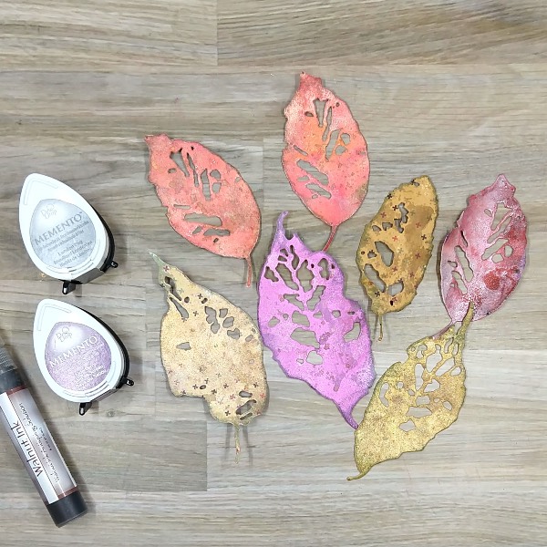 Step 2: Press Walnut Ink colored Walnut Ink Antiquing Solution as well as Elderberry Memento ink onto acetate packaging. Add water to the different parts of the acetate and splatter the die cut leaves with the Elderberry Memento ink. Then watercolor smoosh the leaves with both the Elderberry Memento ink and the Walnut Ink Antiquing Solution. After the leaves dried, rub the edges of the leaves with the London Fog Memento ink pad. Allow everything to dry again.