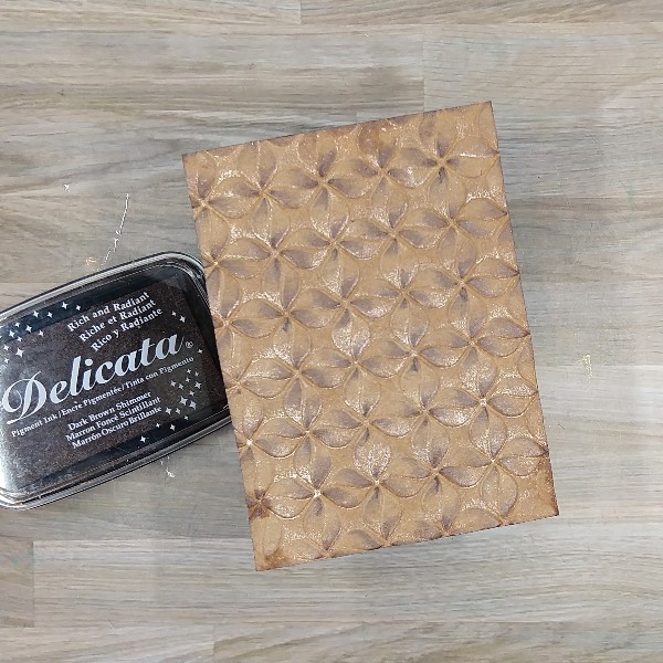Step 4: Use Dark Brown Shimmer Delicata ink to add some color to the panel by brushing the panel lightly across the embossed paper. The raised part of the embossed panel will pick up the dark brown ink, while the other areas will be untouched. Then press the edges with the same Dark Brown Shimmer Delicata ink panel to add color to the border.
