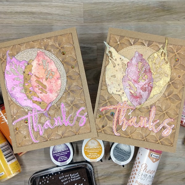 To me, Thanksgiving is mostly about food but also an excuse to say thank you to those people who are a part of my personal and professional life. So I decided to make a thank you card to let people know that I am grateful for them. I decided to use some paper scraps because I always have too many and to enhance them with sprays or ink to transform them. At first, I was planning on making one card with a lot of leaves, but changed my mind after die cutting the leaves, so ended up making two.