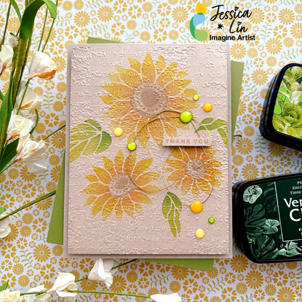 Step 6: To add a little more texture to this simple card, I embossed the stenciled panel with Stampin’ Up’s Timeworn Type embossing folder. Then I embellished the card with Doodlebug Design’s Sprinkles enamel dots and some gold thread and the card is complete!