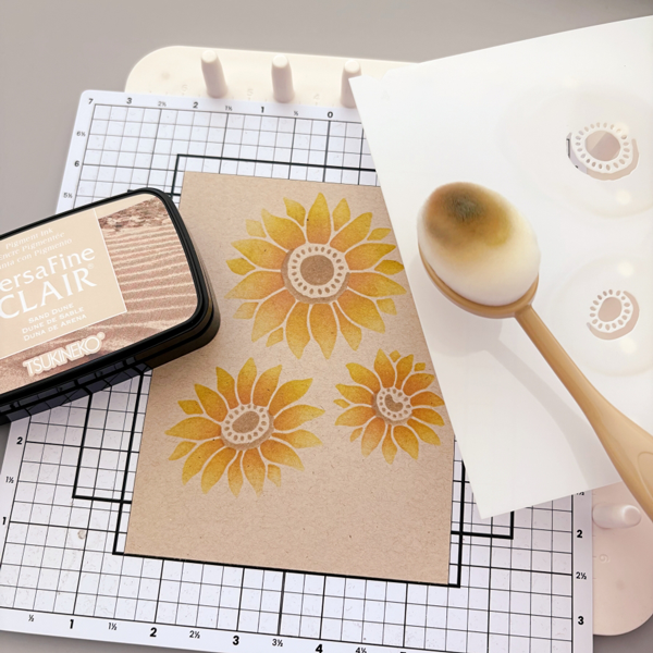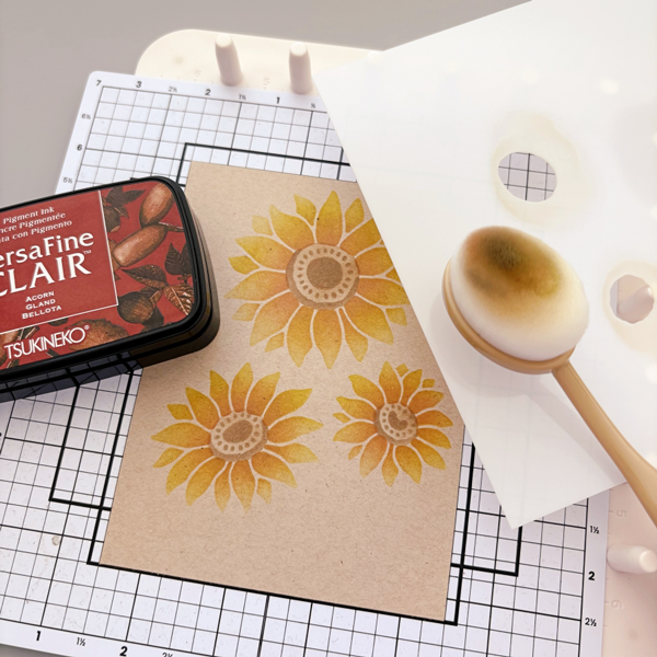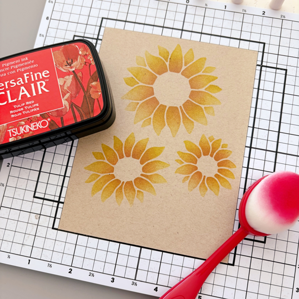 Step 2: Using the same layer of stencil, ink blend the center of the sunflowers with VersaFine Clair Tulip Red ink pad. This is an orangey-red shade on white cardstock, but on kraft cardstock, it has a golden brown undertone.