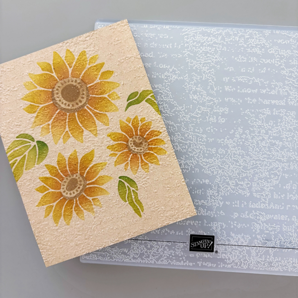 Step 1: Cut a piece of Neenah Desert Storm cardstock to 4’’ x 5 ¼’’. Then ink blend VersaFine Clair Cheerful ink onto Layer 1. The layering stencil set I’m using today is called Abundant Beauty from Stampin’ Up.