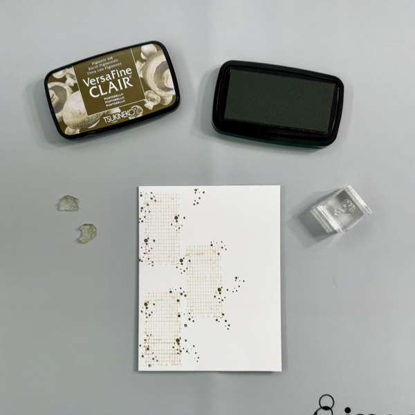 Step 2 Next, stamp another texture stamp (on this one I used dots) randomly on the card using VersaFine Clair Portobello ink pad.
