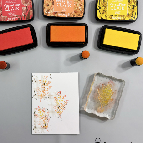First, add the VersFine Clair Cheerful ink randomly on the leaf stamp, then add some of the VersaFine Clair Summertime ink, and then add some of the VersaFine Clair Red Tulip ink. Using sponge daubers is the best way adding the ink that will make the ink blending well directly on the stamp.