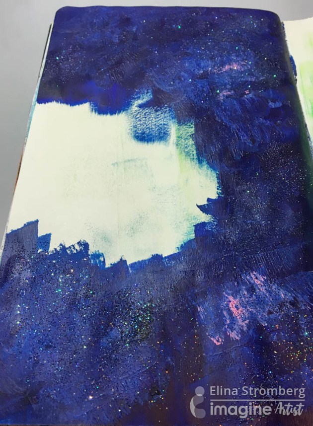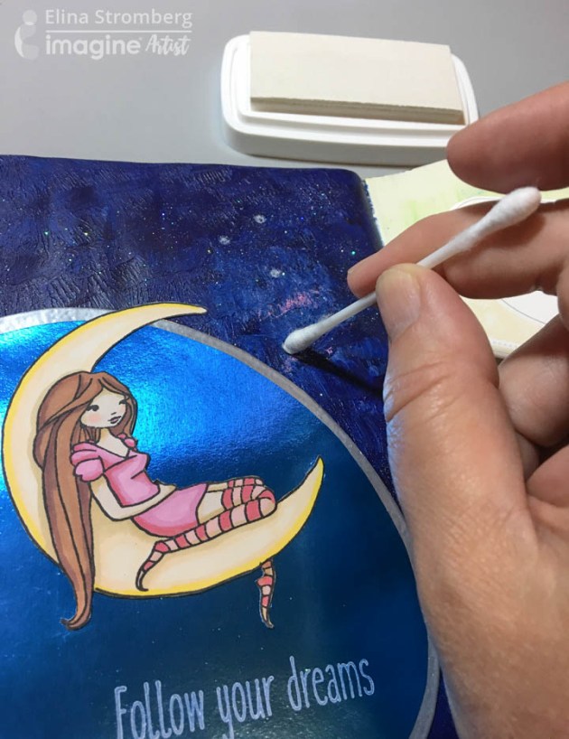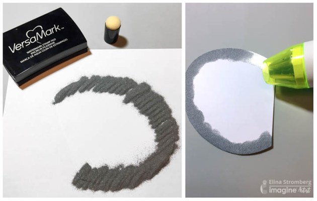 Sprinkle Sparkle Mboss embossing powder over all three images; shake off excess and return the excess to the pouch. Heat each panel to melt the embossing powder.