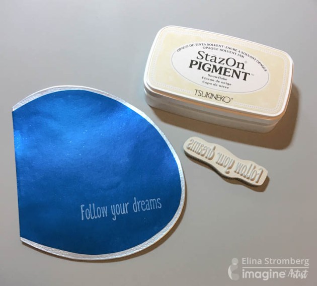 Stamp the sentiment onto a piece of scrap cardstock using VersaFine Clair Nocturne ink. Trim the excess cardstock and mat on a piece of black cardstock.