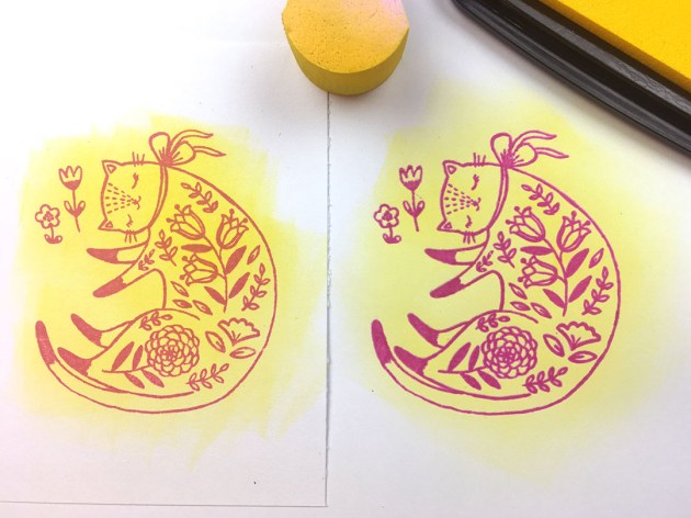 Place the inked acrylic block in the center of the watercolor panel, put something heavy on top (I used a tape dispenser), and leave for a few minutes. The texture of the watercolor paper allows for imperfect color transfer, which I happen to love. If you prefer a smoother look, use paper with less tooth, or texture.