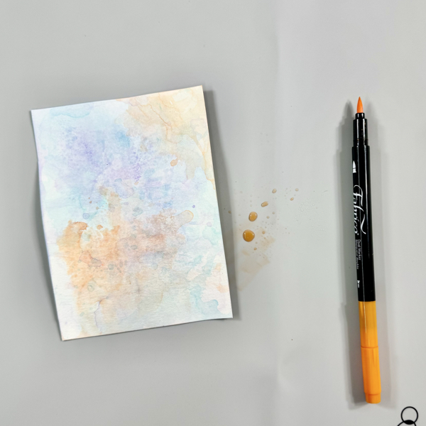 Starting with creating the watercolored background panel by cutting a piece of 140 lb watercolor cardstock into 4 ¼ inch x 5 ½ inch. To pick out the color combo, make sure you pick the colors that won’t turn into a muddy color when they are mixed together.