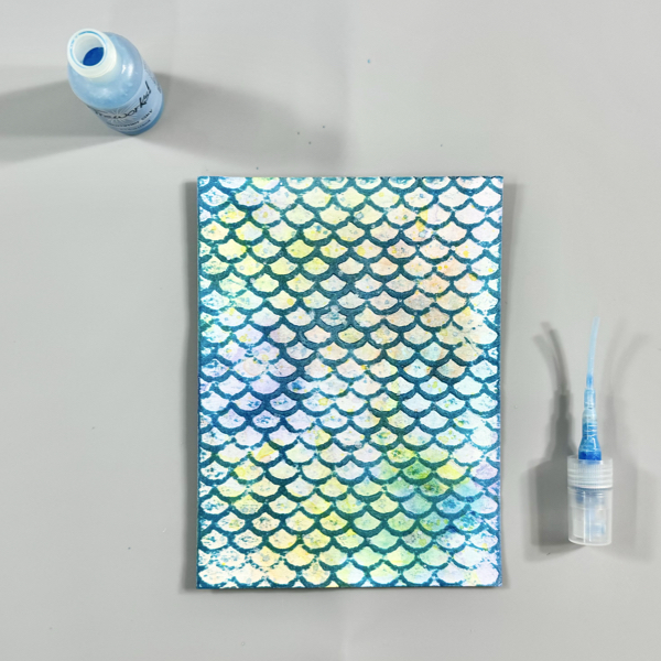 Scribble some of the Tropical Lagoon Fabrico Marker on the craft mat and then spray it lightly with some water. Then, smoosh the watercolor cardstock to the watercolor ink on the mat. Pick it up and dry the watercolor ink on the panel with a craft heat gun. Repeat it until you like the result.