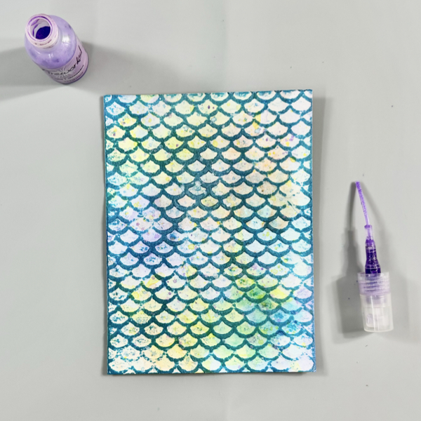Next, open the top of the spray and use it (or small round brush) to add some splatters of the Lulu Lavender Fireworks! Shimmery Craft Spray on the panel.