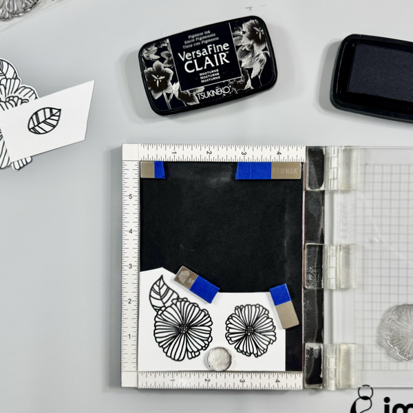 Stamp the flower and leaf images on a white cardstock using the VersaFine Clair Nocturne ink pad with a stamping tool (or acrylic stamping blocks).