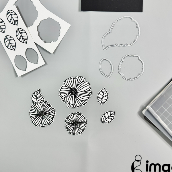 Cut all the stamped flowers and leaves with their matching die set, or you can fussy cut them using micro-tip scissors.