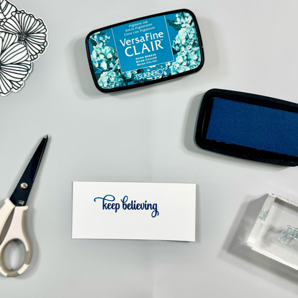 Stamp the sentiment on a white card stock using the VersaFine Clair Warm Breeze ink pad with a stamping block.