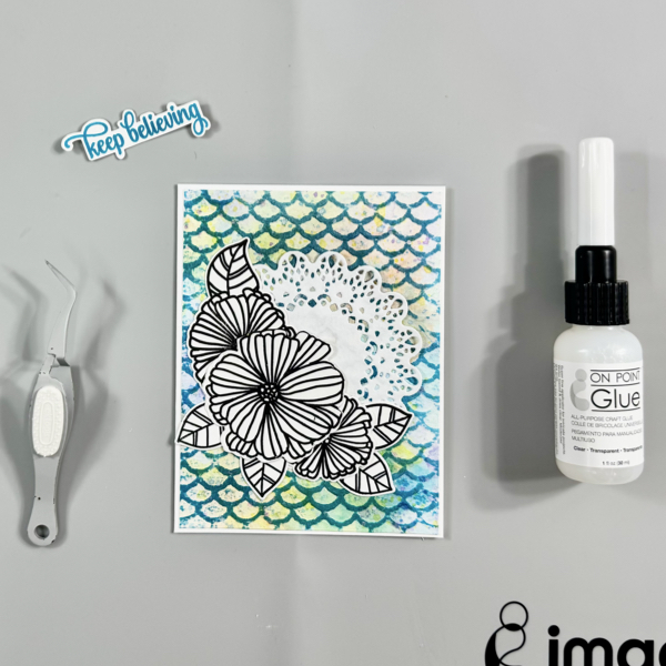 Then, add some of a thin foam to the sentiment with On Point Glue and add it to the card with the same glue.