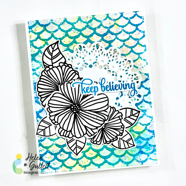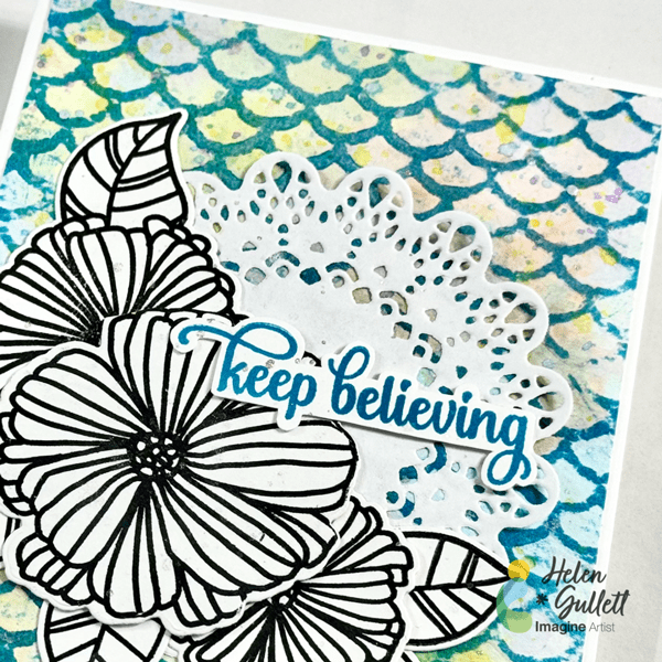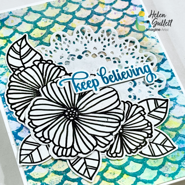 And those layers of doily, flowers, leaves, and sentiment add more dimension to this mixed media card.