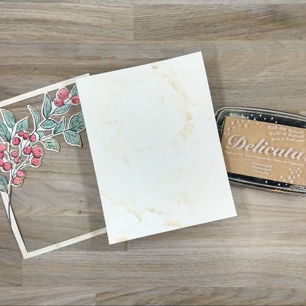 Cut out and distress the edges of 4 pre-printed winter sentiments. Then press the edges into the Golden Glitz Delicata ink pad. Heat emboss each of the sentiments with clear embossing powder.