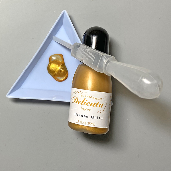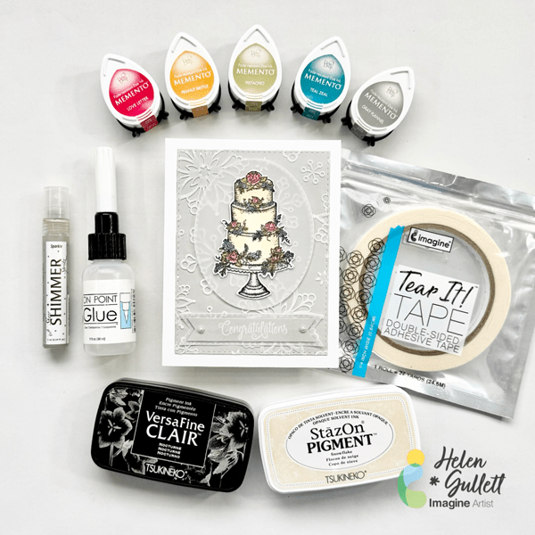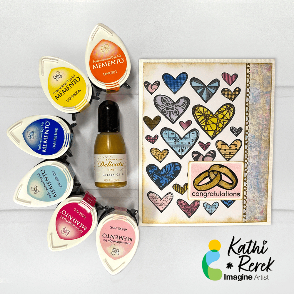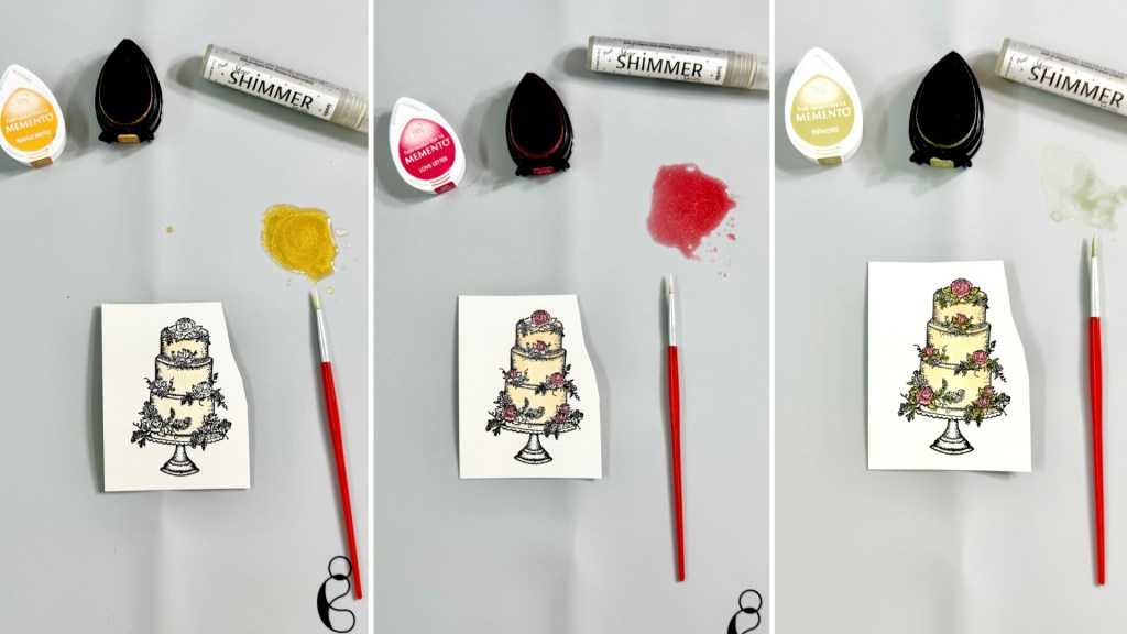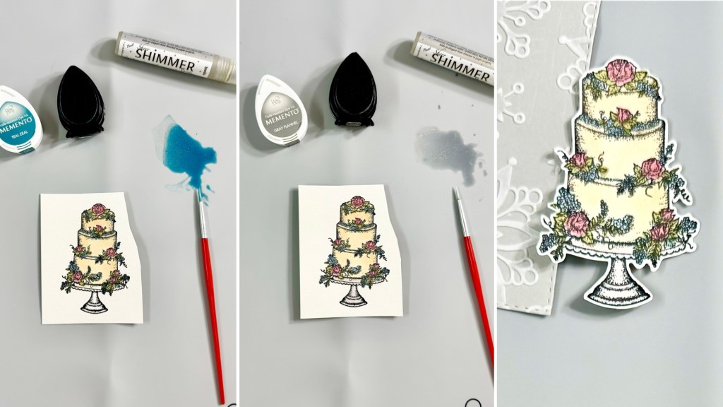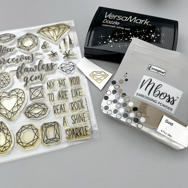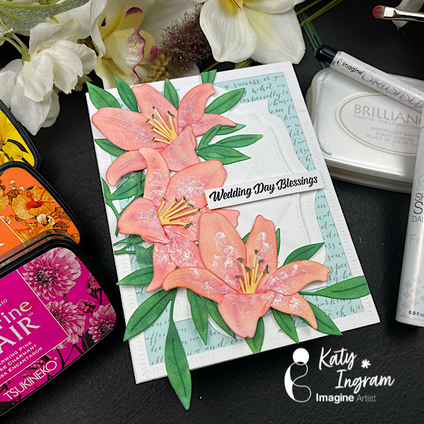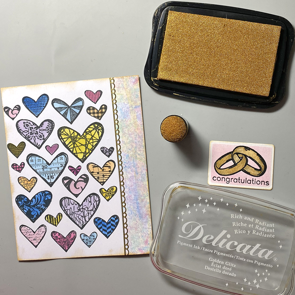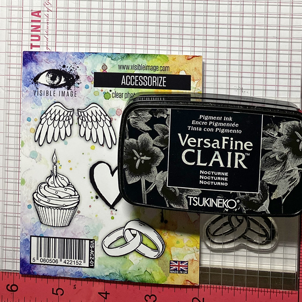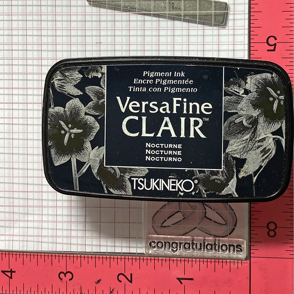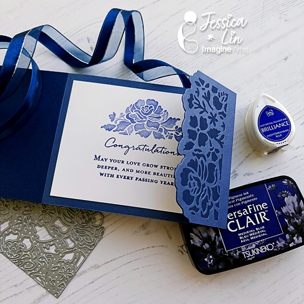 This stamp set also includes some beautiful sentiment stamps that are perfect for wedding cards. I decided to use VersaFine Clair Medieval Blue ink pad to stamp the sentiment since this ink is known for giving crisp, clean lines. It is my favorite type of ink pad for sentiment stamping.