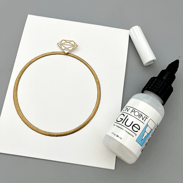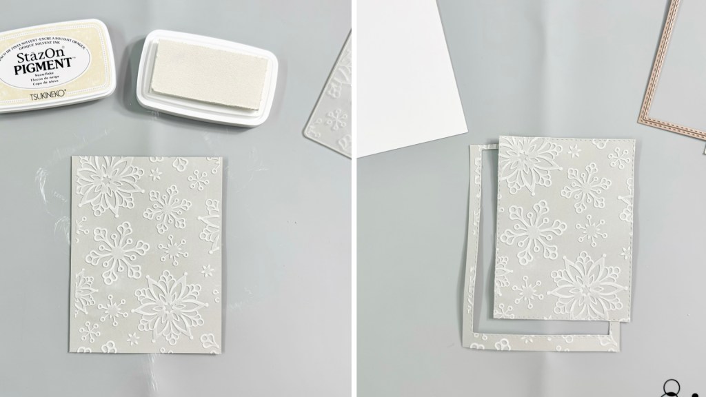 On a piece of 4 ¼’’ x 5 ½’’ cardstock, score at 3 ⅜’’ and 8 ⅞’’. Then adhere Stick-It adhesive to the inner left and right flaps of the card. The Stick-It adhesive is great for sticking down large pieces of intricate die cut. If you don’t have the Stick-It adhesive, a great alternative would be liquid glue with fine-tip nozzles, such as the On-Point Glue.