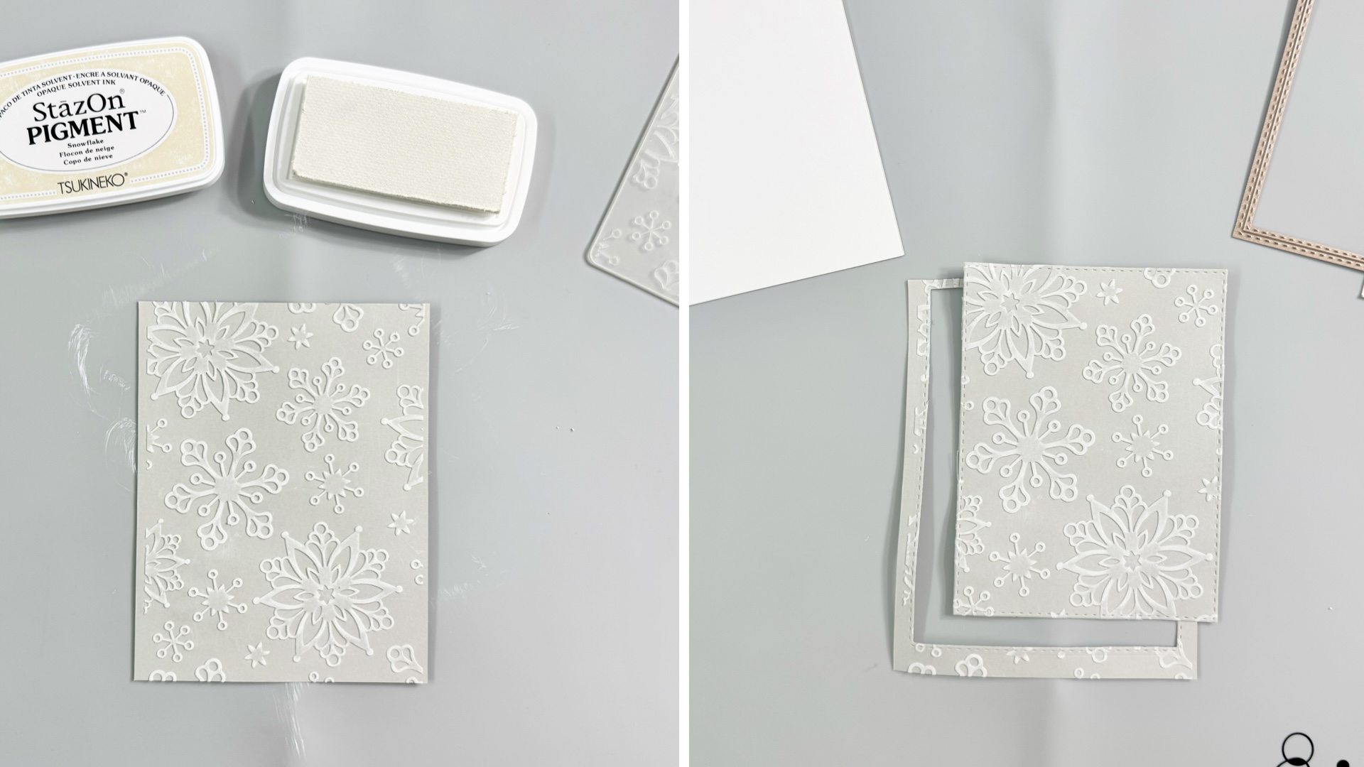 Using a Misti or stamp positioner and a grip mat place the cardstock panel in the center. Place the floral stamp on the corner of the panel and ink with shimmer ink (I used Delicata Silvery Shimmer) stamp, you may have to stamp more than once to get a clean image. Turn your paper, no need to move the stamp thanks to the Misti and ink it up and stamp again on the other corner. This ink is a pigment ink therefore it takes a little longer to dry, you can speed that up by heat setting it.