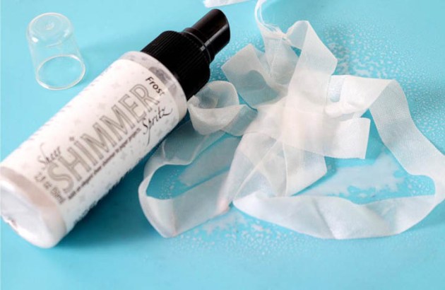 Mist a piece of ribbon using Sheer Shimmer Spray in Frost. The spray gives the ribbon an off-white finish that is gorgeous. Dry the ribbon with a heat tool.