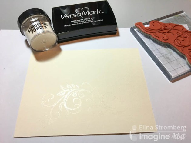 Decorate the card background with a swirl stamp. Stamp the pattern on a piece of cream color cardstock using clear VersaMark ink. Place the stamped card on a sheet of printing paper and cover the image with Embossing Powder in White. Lift the card; the fine embossing powder will stick to the clear ink. Using the sheet of printing paper pour the powder back to the container.